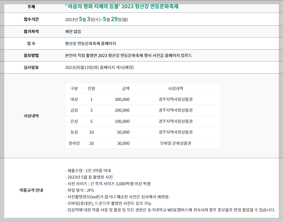 형산강 연등문화축제는 동국대 WISE캠퍼스와 불국사,경상북도,경주시가 신라 연등회의 맥을 잇고 부처님 오신 날을 봉축하기 위해 개최하는 축제다.축제기간동안에는 생태숲에서 금장대까지 형산강을 밝히는 연등 숲과 서천교에서 금장교까지 이어지는 거리연등 전시로 희망을 불을 밝힌다.그 장관을 보고 있으면 마음이 벅차오르기도 하면서 평온해지는,뭔가 오묘한 감동을 선사받게 되는데,형산강 연등문화축제에 대한 정보를 공유하는 시간을 가져 보겠다.