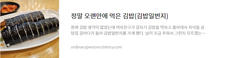 | 김밥일번지 : 정말 오랜만에 먹어본 맛이 보장된 김밥 (13) | 2023.03.19 |