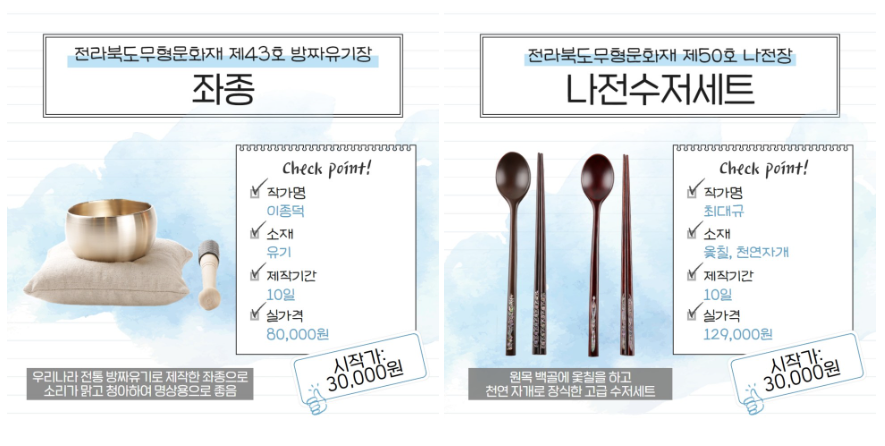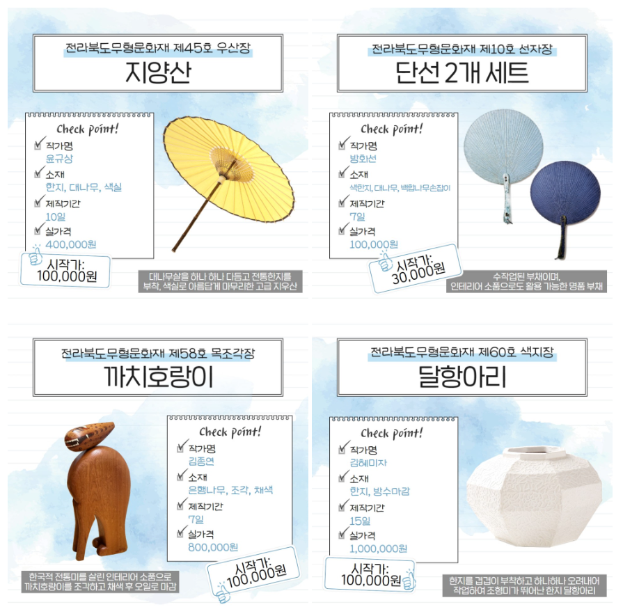 명인명장 공예옥션은 전통 및 현대 작품, 정교한 액세서리, 실용적인 가정용품을 포함한 다양한 공예품을 선보인다. 작품마다 감정가가 10만 원에서 100만 원까지 천차만별이다. 참석자들은 공예품의 풍부한 다양성을 탐구하고 재능 있는 장인의 숙달을 목격할 수 있는 기회를 가진다.