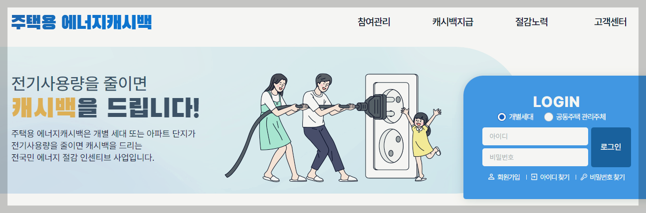 | 신청대상 | 주택용(가정용) 고객 중에서 신청 주소지에 거주하는 것이 확인이 된 사용자(주민등록표상 구성원) ※직전 2개년 사용전력량 중 최소 1개년은 사용전력량이 있는 경우에만 참여가능하다. ☆참여 제외 고객 - 고압아파트 개별세대 사용전력량 정보가 제출이 되지 않는 고객 - 신규 전기사용 등으로 직전 1개년 동월분의 사용전력량 자료가 없는 고객 - 한전이 시행하는 에너지절약 프로그램에 이미 참여하고 있는 고객 |