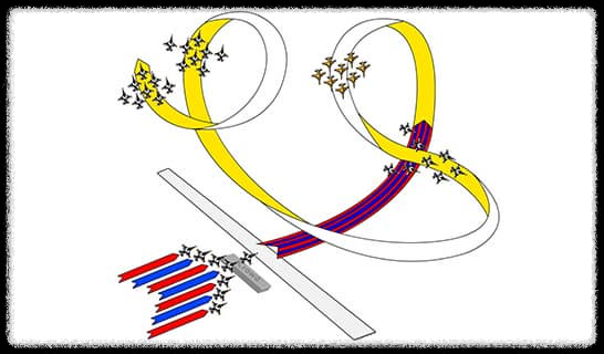 블랙이글스는 총 8대의 항공기를 기본 편대로 구성되어 있다. Leader는 전체 대형을 이끌고, Left wing, Right wing, Slot은 Leader와 함께 포메이션 기동을 선보인다. Synchro-1와 Synchro-2는 솔로와 함께 다양한 포메이션, 절제된 기동을 보여주며 Solo-1, Solo-2는 역동적이고 스릴 있는 기동을 보여준다.