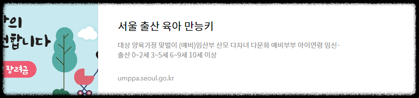 | 편한외출 | 서울엄마아빠 VIP존 조성, 가족화장실 조성, 가족배려주차장 조성, 서울암마아빠택시 운영, 서울키즈 오케이존 지정 | 바로가기↑ |