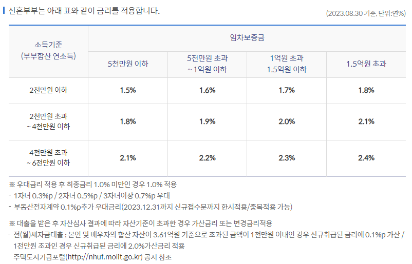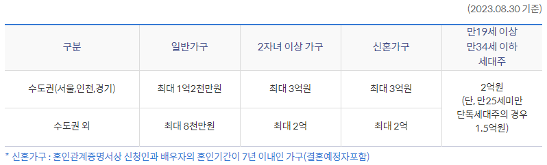| 대출대상주택 | - 임차 전용면적이 85㎡ 및 임차보증금 수도권 3억원이하 주택(지방 100㎡, 2억원) - 신혼가구 : 수도권 4억원 / 비수도권 3억원 |