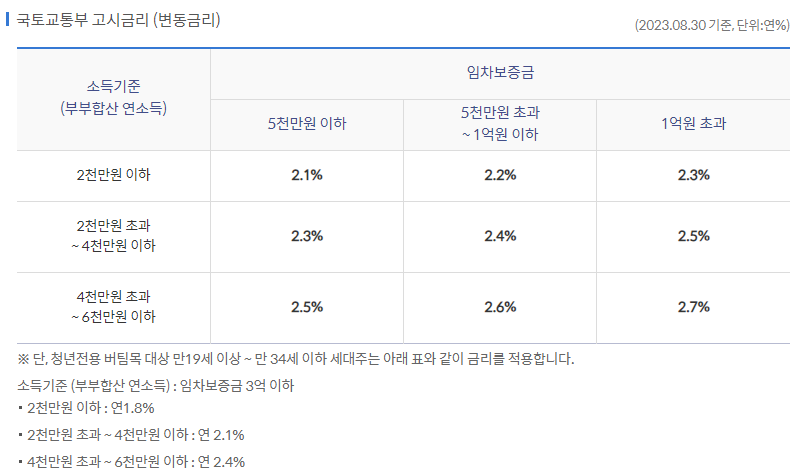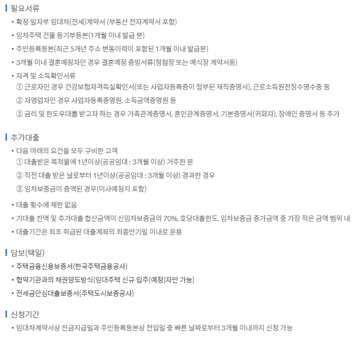 | 대출대상 | 대출신청일 기준 대출대상주택을 임차하고자 주택임대차계약을 체결하고 임차보증금의 5%이상을 지불하면서 아래 모든 요건을 갖춘자 ①대출신청일 기준 민법상 성년인 세대주 또는 세대주로 인정되는 사람 ②대출신청일 기준 세대주로서 세대주를 포함한 세대원 전원이 무주택인 사람 ③부부합산 연소득이 50,000,000원 이하인 사람 |