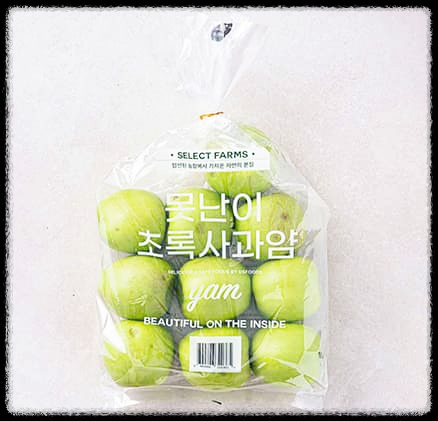 ①아오리 : 일본에서 유래한 품종으로 녹색의 껍질에 흰색 속살을 가지고 있다. 당도가 높고 아삭한 식감 및 상큼함이 특징이다. 껍질째 먹을 수 있으며 안정성 기준에 맞춰 생산된 원료만을 엄선한 안심사과 원료로 사용되어 안저성이 부종 되어 있다.