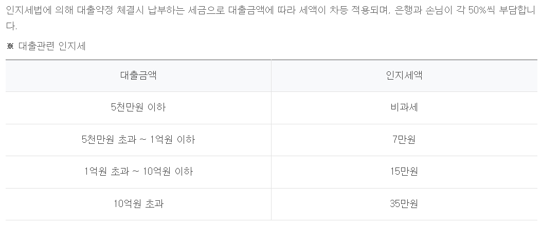 | 대출관련비용 | - 주택도시보증공사 보증료(손님부담) : 전세보증금 반환보증금의 연 0.115% ~ 연 0.154%+대출금의 연 0.031% ※채권양도통지비용 3만원은 면제 - 인지세 ![]() |