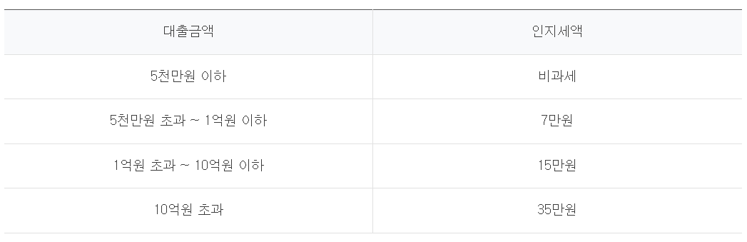| 인지세 | 인지세법에 의해 대출약정 체결시 납부하는 세금으로 대출금액에 따라 세액이 차등 적용되고 은행과 고객이 50%씩 부담한다.![]() |